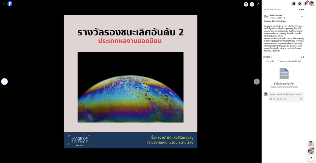 ภาพนี้ไม่ใช่เพียงแค่ความสวยงามของสีสันบนผิวฟองสบู่ แต่คือการบันทึกปรากฏการณ์ทางฟิสิกส์ที่เรียกว่า “การแทรกสอดของแสง” (Thin-film Interference) เมื่อแสงตกกระทบลงบนฟิล์มบางๆ ของสบู่ที่มีความหนาต่างกันเพียงไม่กี่ไมโครเมตร ทำให้เกิดการสะท้อนและหักเหออกมาเป็นสีสันที่แปรเปลี่ยนไปตามความหนาและความเข้มของมวลสาร